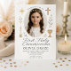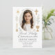 Célébrez le moment sacré de votre fille avec cette élégante invitation pour la Première Communion. Caractéristiques d'un bord festonné délicat, des illustrations religieuses dorées (croix, cierge, calice) et un cadre photo ovale. Parfait pour une communion traditionnelle, rustique ou moderne