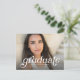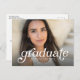 Cette faire-part de graduation avec une photo et une invitation comprend une photo pleine image avec le mot "gradué" dans une police amusante de style rétro. Cette simple carte postale offre également de la place pour le nom du diplômé, l'école et l'année ou d'autres détails que vous voulez partager. Le dos est une invitation à la fête de remise de diplômes avec beaucoup de place pour tous les détails de la fête.
