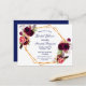 Sur le devant : Un arrière - plan blanc avec un cadre géométrique en faux or. Décorée de fleurs bordeaux foncé et roses, de plumes roses et boho. Modèles pour le nom de la mariée et les détails du parti. Le nom est écrit avec un script de style écrit à la main, des lettres de couleur boucane. Retour : arrière - plan bleu marine.