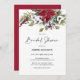 Christmas Winter Poinsettia Bridal Shower Invitation est créé par szdesign. Préparez la scène pour une fête festive avec cette invitation à la douche nuptiale Poinsettia! Cette invitation présente des poinsettias rouges vibrantes associées à des accents de baies verdoyantes et délicates, créant une esthétique de vacances classique à la fois élégante et chaleureuse. Le design est complété par des polices sophistiquées dans des teintes d'inspiration vacances, ce qui fait que les détails de l'événement se démarquent magnifiquement. Idéal pour toute future mariée qui aime la période des fêtes, cette invitation apporte une touche de magie de Noël à son jour spécial !