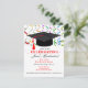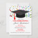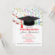 Invitation à la fête de la GRADUATION festive avec des serpentins colorés et un casquette noir traditionnel avec une mouche rouge. Modifiez les deux côtés de cette invitation.