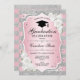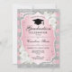 Invitation à la fête de remise des diplômes. Caractéristiques rayures, police de script, roses blanches, goût et confetti. Design élégant rose avec fausse parties scintillant argent. Parfait pour une élégante célébration glam bling chic.