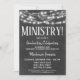 Une amusante invitation à la fête de remise des diplômes du ministère en noir et blanc avec des lumières brillantes au sommet.