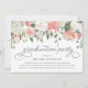 L'invitation à la fête de graduation florale d'aquarelle moderne comporte une bordure supérieure de roses, de pivoines et d'eucalyptus dans les tons rose roux, pêche, crème et vert. Personnalisez avec le libellé de l'invitation de la fête de remise de diplômes souhaité en utilisant les champs modèle.