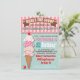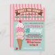 Une invitation à la fête d'anniversaire inspirée par un ancien salon de crème glacée avec une illustration de boules de crème glacée dans différents motifs empilés les uns sur les autres avec une typographie amusante, un auvent rayé, une bannière et des cerises sur un arrière - plan aqua vintage. Idéal pour un anniversaire ou un groupe de glaces. Illustration tirée à la main par McBooboo.