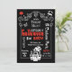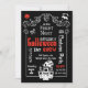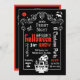 Design de typographie délicieusement éffrayant en blanc et orange avec arrière - plan noir. Ces invitations à la fête d'Halloween ont une maison hantée, citrouille et chauves-souris comme accents amusants. Customisez avec vos informations de fête. Le dos de la carte a un design correspondant.