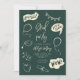 Carte d'invitation à la fête de remise de diplômes amusante avec illustration dessinée à la main des icônes de remise de diplômes et de l'école en vert.