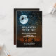 Une invitation magique à la fête d'Halloween avec un cimetière éffrayant en pleine lune avec une sorcière volant sur un balai, chauves-souris. Un arbre aux lumières étincelantes apporte une touche festive.