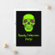 Un crâne vert effrayant avec les yeux rouges qui brillent sur le devant de l'invitation. Le verso de la carte vous pouvez customiser votre message et les détails. Profitez de votre fête d'Halloween !