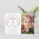 Cette belle et élégante invitation au troisième anniversaire comporte une couronne florale illustrée avec les mots "Fêtons" encerclant le numéro 3. La couleur du texte, la police, le message et la photo peuvent être changés à votre goût. L'arrière de l'invitation est orné d'un arrière - plan rose (qui peut être échangé à n'importe quelle couleur de votre choix) avec un motif en quatrefoil blanc. Une façon idéale pour les invités invitations de célébrer l'anniversaire spécial d'une fille.