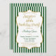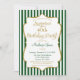 Une élégante invitation à la fête d'anniversaire en vert foncé et or, avec des rayures vert et blanc chasseur et cadre de texte de parties scintillant d'or. Le cadre de texte de parties scintillant sur cet invitation de fête d'anniversaire classique et classe présente une ombre pour donner un aspect surélevé. Cet invitation de fête surprenant vert pin et or est sûr de satisfaire cette vedette d'anniversaire spéciale dans votre vie. Parfait pour les anniversaires jalons tels que 18ème 20ème 21ème 30ème 35ème 45ème 55ème 55ème 60ème 65ème 70ème 75ème 80ème 85ème 90ème 95ème et 100 ...ou n'importe quel âge !
