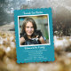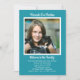 Faire-part d'adoption photo encadrée pour une fille de tout âge, mais parfait pour un enfant plus âgé. Bleu assez turquoise avec texte blanc. Inclure une photo avec des informations sur la fête pour célébrer le nouveau membre de la famille. Un script audacieux en haut est pour son nom avec "Bienvenue à la famille" sous la photo. Le texte de toutes les parties est ajouté sous forme de paragraphe à l'aide d'une police imprimée moderne. L'inverse est bleu solide. Téléchargez une photo de l'une ou l'autre orientation pour l'adapter au cadre carré.