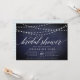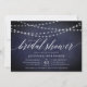 Nos élégantes invitations à la douche nuptiale en bleu et blanc chic de minuit présentent un arrière - plan bleu de minuit richement texturé avec des cordes de lumières blanches sur le dessus, et "douche nuptiale" dans la typographie de script de calligraphie chic. Personnalisez avec votre douche nuptiale et les détails du registre en dessous en lettres blanches.