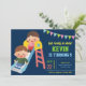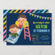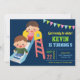 Éblouissez vos invités avec cette invitation colorée de fête d'anniversaire avec un joli toboggan pour enfants avec une typographie vibrante contre un arrière - plan bleu. Ajoutez simplement les détails de votre événement sur ce modèle facile à utiliser pour en faire une invitation unique. Retournez la carte pour révéler un motif à rayures colorées au dos de la carte.