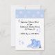 Une invitation amusante à la fête du patinage d'anniversaire. Une paire de patins bleus avec de petites flocons de neige qui tombent autour d'eux. Une bordure supérieure de bleu avec des pois blancs.
