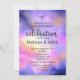Une élégante invitation à la partie fiançailles avec un joli mélange de pastels et de couleurs vives. Illustration abstraite colorée avec une image cosmique de l'espace dans les aquarelles rose, violet et jaune. Les couleurs se mélangent et se mélangent pour créer des formes éthérées lumineuses avec de petites étoiles scintillantes partout.