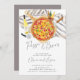 Pizza & brws décontractés et amusants invitation à la fête de fiançailles avec une pizza sur une peau de pizza avec des bouteilles de bière et de vin sur une nappe neutre taupe & rayures blanches. Disponible dans notre boutique pour une douche nuptiale et un dîner de répétition.