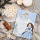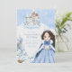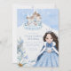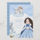 Cette adorable invitation à la Princess Tea Party hivernale enneigée présente une belle jeune princesse aux cheveux noirs portant une robe de flocon bleu et blanc et une cape à fourrure chaude doublée. La princesse tient une tasse de thé avec un flocon de neige bleu sur le devant. Au loin se trouve un château enneigé avec une bannière qui dit "rejoignez-nous pour un thé princesse". Vous pouvez personnaliser avec tous les détails spéciaux de votre fête!