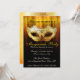 Invitation de luxe dorée pour célébration de soirée masquée. Une invitation élégante et sophistiquée présentant un masque de soirée masquée doré avec des fioritures noires, un fond doré avec un motif damassé subtil se fondant dans du noir et une typographie élégante personnalisable pour les détails de votre soirée.