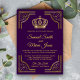 Étonnez vos invités avec ce carton d'invitation de mariage sur le thème royal, doté d'une bordure dorée élégante et d'une belle couronne sur fond violet foncé. Ajoutez simplement les détails de votre événement à ce modèle facile à utiliser pour en faire une invitation unique. Retournez la carte pour révéler un beau motif au verso. Cette invitation est entièrement personnalisable. Tous les textes sont modifiables et la couleur de fond peut être facilement modifiée pour s'adapter à vos préférences.