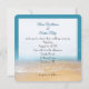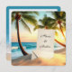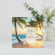 Un papier d'invitation vierge avec enveloppe repose sur une plage de sable sur fond de palmiers doucement balançants et d'un océan serein sous un soleil couchant animé pour un invitation de mariage à la plage. Tout le texte peut être modifié.