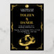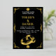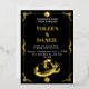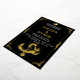 Invitation de mariage élégante avec feuille dorée et noire. Un cadre doré orné et des ornements décorent un fond noir foncé élégant pour un effet dramatique.