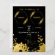 Invitation de mariage élégante noire et dorée à motif feuille d'or. Un cadre doré orné et des ornements décorent un fond noir foncé élégant pour un effet dramatique.