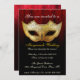Invitation de mariage fantaisie avec masquerade. Une invitation élégante et chic présentant un masque de masquerade doré avec des fioritures noires, un fond de couleur canneberge avec un motif damassé subtil se fondant dans du texte noir et élégant qui peut être personnalisé pour les détails de votre soirée.