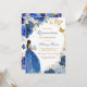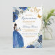 Célébrez un jalon spécial avec cette invitation de Quinceañera élégante représentant une jeune fille dans une robe bleue fluide entourée de papillons dorés et d'accents floraux bleus. Le fond texturé marbré et les détails dorés scintillants créent un design luxueux parfait pour honorer cette occasion inoubliable. Personnalisez avec les détails de l'événement pour le rendre unique.