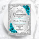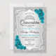 Quinceanera invitation à la fête. Design élégant en parties scintillant argent et turquoise. Il comprend des bandes, des caractères de script, des roses, des tiaras et des confettis. Idéal pour une élégante princesse glam style 15ème anniversaire célébration. Invitations Zazzle imprimées ou téléchargement instantané modèle imprimable numérique.
