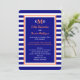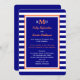 Cette invitation de réception de mariage à rayures présente un thème nautique avec des rayures bleues marine et blanches en arrière-plan. Les détails de votre invitation apparaissent sur fond bleu marine bordé de blanc et de corail. Vous pouvez placer votre monogramme en haut et fournir les détails du lieu où vous vous êtes mariés, ainsi que les détails de votre réception après le mariage. Copyright henishouseofpaper