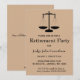 Cette carte d'invitation modifiable présente les balances de la justice sur un fond marron. Ci-dessous se trouvent les détails modifiables de l'événement. Cette carte est présentée pour la retraite d'un juge, mais elle peut également être utilisée pour toute raison de célébration (diplôme, nouvel emploi, promotion, retraite) pour toute profession juridique.