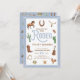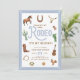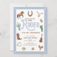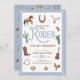 Cette mignonne invitation de cowboy dit "ce n'est pas mon premier rodéo, c'est mon deuxième !" dans un texte occidental en détresse. Autour, il y a des illustrations d'aquarelle sauvage de l'ouest. Il a fini avec une bordure bleue poussiéreuse et un petit détail de coeur.
