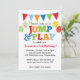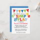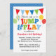 Notre invitation colorée Jump & Play Balloons dans les couleurs primaires comporte des lettres colorées, des motifs et des ballons et constitue une invitation parfaite pour toute fête d'enfant avec un thème de bounce house, trampoline ou saut et jeu.