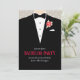 Invitation de fête de bachelor élégante avec graphique du marié en smoking et une seule rose rouge. Modifiez ces invitations avec vos propres mots, le nom du marié et les détails de l'événement de pré-mariage. © Conception unique et illustration graphique par Sarah Trett. www.sarahtrett.com pour www.mylittleedenweddings.com