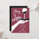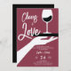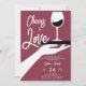Une invitation à la douche d'un couple moderne, élégant et chic avec un thème de dégustation de vin. Il présente l'illustration rétro d'inspiration vintage d'une main tenant un plateau avec un verre de vin et le titre "Cheers to Love" dans un script moderne ludique. Une invitation chic à déguster des vins wedding shower pour un couple moderne qui aime le vin et l'expérience vinicole.