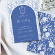 Delft blue floral wedding invitation card, designed in a refined blend of chinoiserie and French toile de Jouy style. The soft botanical illustrations frame an arched layout featuring an elegant wedding crest monogram, perfect for couples who love vintage, historic, and European-inspired aesthetics. Classic script typography pairs beautifully with the ceramic-blue palette, making this design an effortless nod to the tradition of “something blue.” Fully customizable with your names, date, and location, it’s an exquisite choice for any romantic or sophisticated wedding theme.