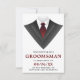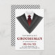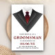Invitez vos garçons d'honneur avec cette carte de demande moderne représentant un smoking classique avec une cravate rouge sur fond blanc. Ajoutez simplement vos informations d'événement sur ce modèle facile à utiliser pour en faire une invitation unique. Retournez la carte pour révéler un motif de rayures noires et blanches au dos de la carte.