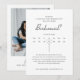 Rendez votre demande de demoiselle d'honneur inoubliable avec notre carte photo de calendrier moderne. Ce design élégant présente une mise en page de calendrier personnalisable où vous pouvez mettre en évidence votre date spéciale, associée à un cadre photo chic pour un touche personnelle. Avec un texte modifiable, vous pouvez facilement créer des cartes de témoin de mariage également. C'est l'ajout parfait à votre boîte-cadeau de demoiselle d'honneur, alliant style moderne et sentiment sincère. Personnalisez avec vos détails et rendez votre proposition aussi mémorable que le jour lui-même.