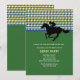 Une invitation sportive idéale pour une fête du Kentucky Derby ou pour toute occasion liée aux courses de chevaux. La carte présente un motif de Jacquard bleu, vert et blanc sur le dessus, un fond vert solide et un jockey silhouette sur un cheval en noir.L'invitation est facile à customiser avec votre libellé, police, couleur de police et choix de six types de papier.