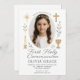 Célébrez le moment sacré de votre fille avec cette élégante invitation à la première communion. Caractéristiques : un bord dentelé délicat, des illustrations religieuses en or doux (croix, bougie, calice) et un cadre photo ovale. Parfait pour une communion traditionnelle, rustique ou moderne