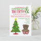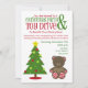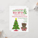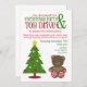 Une invitation pour une fête de Noël et le jouet conduisent comporter un modèle de couleurs et et une illustration rouge et verte d'un arbre de Noël et un ours brun avec les pattes et les oreilles rayées rouges et blanches. Personnalisez le texte avec des détails de votre occasion.