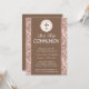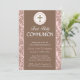 Cette invitation communion présente une croix brune au-dessus de l'écriture Première Communion sainte en blanc, sur un arrière - plan brun cacao. Accentuer les côtés de l'invitation est un motif feuille rose et marron doux. Votre texte personnalisé en blanc avec le nom en rose assorti complète cette gracieuse invitation religieuse. Graphisme avec l'aimable autorisation de Dotted Daisy Designs
