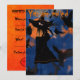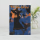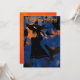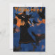Invitation à une fête d'Halloween représentant un dessin animé d'une sorcière sur un balai volant dans la nuit avec un assortiment de merles et de vautours. Coloré avec des oranges, des noirs et du bleu foncé.
