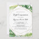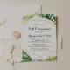 Cette première invitation de communion tropicale à destination géométrique est parfaite pour un événement religieux moderne. Le design se compose de palmiers verts aquarelés peints à la main et de feuilles de bananes soigneusement arrangés en de beaux bouquets, ornant un cadre géométrique doré.