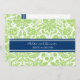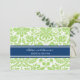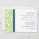 Invitations faites sur commande de dîner de répétition dans le bleu marine foncé moderne et élégant, le motif vintage vert pomme et blanc lumineux de damassé florale chic et classique. Personnalisez le texte pour créer une invitation unique pour votre dîner de répétition de mariage. Contactez-nous pour demander un changement de couleur. Disponible dans beaucoup de produits assortis de mariage.