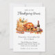 Cette invitation personnalisée présente un élégant thème de dîner Thanksgiving. Au centre se trouve une image aquarelle de divers aliments et floraux provenant d'un dîner d'action de grâces. Une dinde rôtie est placée entre une tarte aux pommes et une bouteille de vin. Un citrouille festif et un feuillage d'automne sont placés derrière la fête.