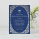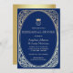 Dîner de répétition bleu marine simple, moderne et élégant Invitation avec monogramme de couronne d'or royal au sommet, et cadre floral art-déco.