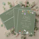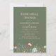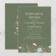 Une invitation au dîner de répétition vert olive terreux présentant de délicates fleurs sauvages disposées dans une composition botanique inspirée d'un pré. Le fond olive chaud et les détails floraux naturels créent une atmosphère romantique de campagne parfaite pour les célébrations prénuptiales.