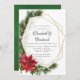 Invitation de dîner de répétition de mariage de Noël rustique tendance avec cadre géométrique doré et typographie manuscrite avec clochettes de traîneau, fleurs de poinsettia, houx, gui et pin.